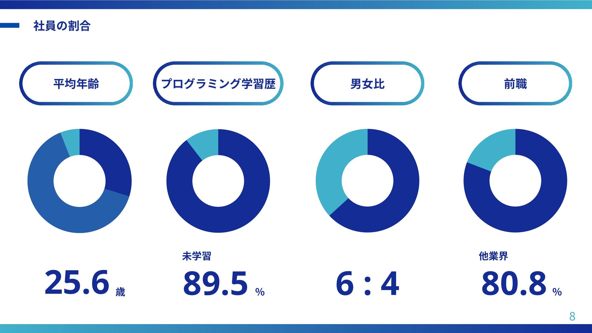 社員の割合 25.6 歳 プログラミング学習歴 平均年齢 男女比 前職 89.5 未学習 %
