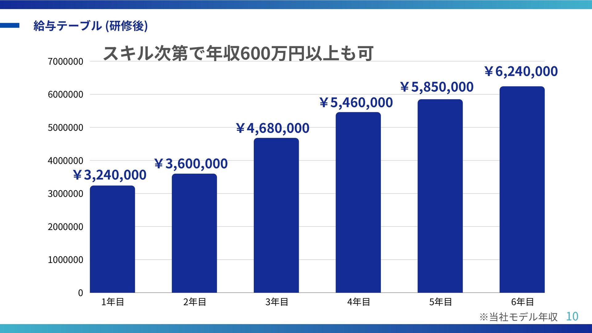 1000000 2000000 3000000 4000000 5000000 6000000 7000000 ¥3,240,000 ¥3,600,000 ¥4,680,000 ¥5,460,000 ¥5,850,000 ¥6,240,000 ※当社モデル年収 10