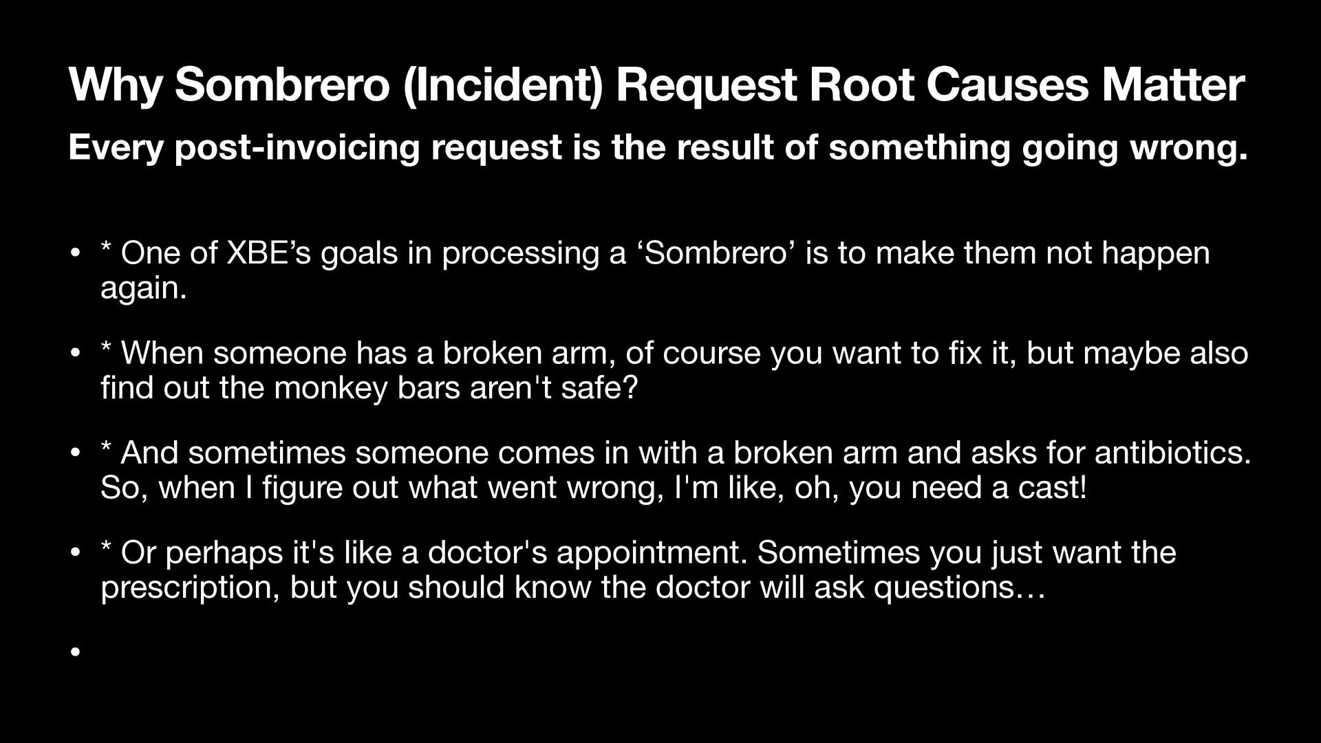 is the result of something going wrong. • * One of XBE’s goals in processing a ‘Sombrero’ is to make them not happen again. • * When someone has a broken arm, of course you want to fi x it, but maybe also fi nd out the monkey bars aren't safe? • * And sometimes someone comes in with a broken arm and asks for antibiotics. So, when I fi gure out what went wrong, I'm like, oh, you need a cast! • * Or perhaps it's like a doctor's appointment. Sometimes you just want the prescription, but you should know the doctor will ask questions… •
