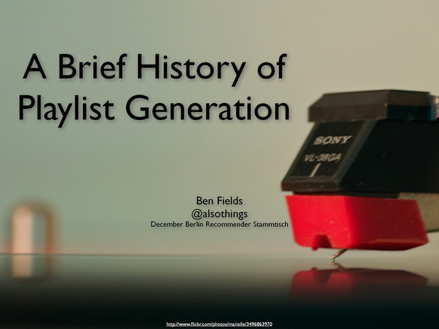 A short history lesson in playlists, from both humans and computers, followed by a short survey of scholarly literature on the evaluation of generated playlists. Slidedeck was presented at the 5th Recommender Stammtisch at Sound Cloud HQ in Berlin on 19 December 2012