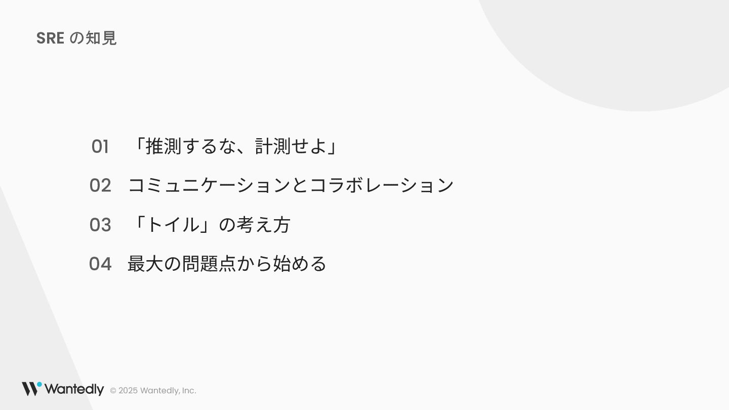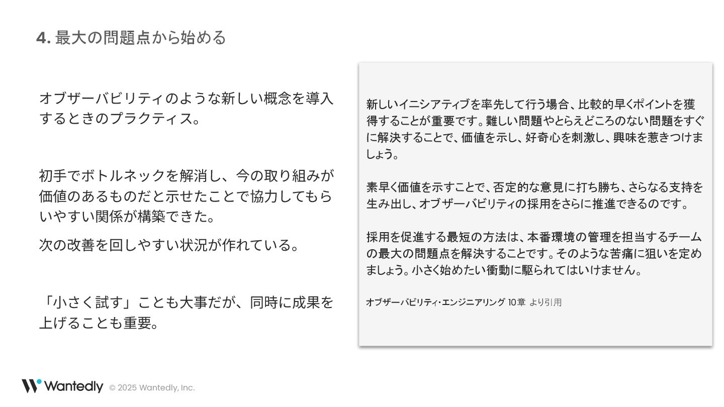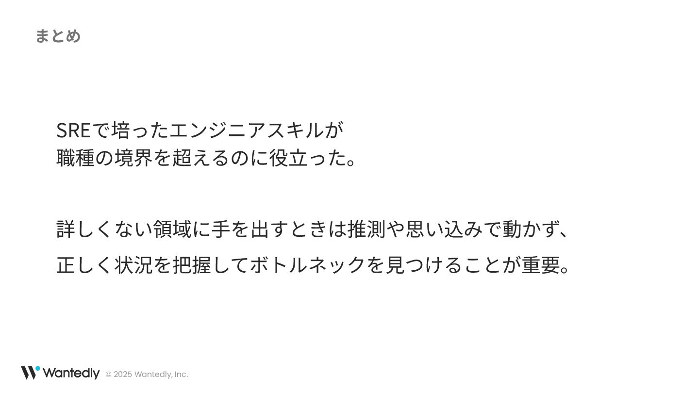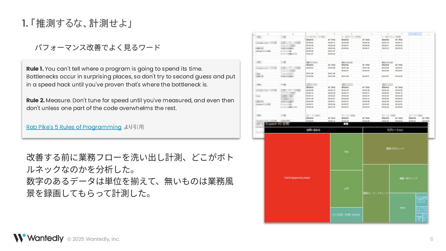 You can't tell where a program is going to spend its time. Bottlenecks occur in surprising places, so don't try to second guess and put in a speed hack until you've proven that's where the bottleneck is. Rule 2. Measure. Don't tune for speed until you've measured, and even then don't unless one part of the code overwhelms the rest. Rob Pike's 5 Rules of Programming より引用 改善する前に業務フローを洗い出し計測、どこがボト ルネックなのかを分析した。 数字のあるデータは単位を揃えて、無いものは業務⾵ 景を録画してもらって計測した。