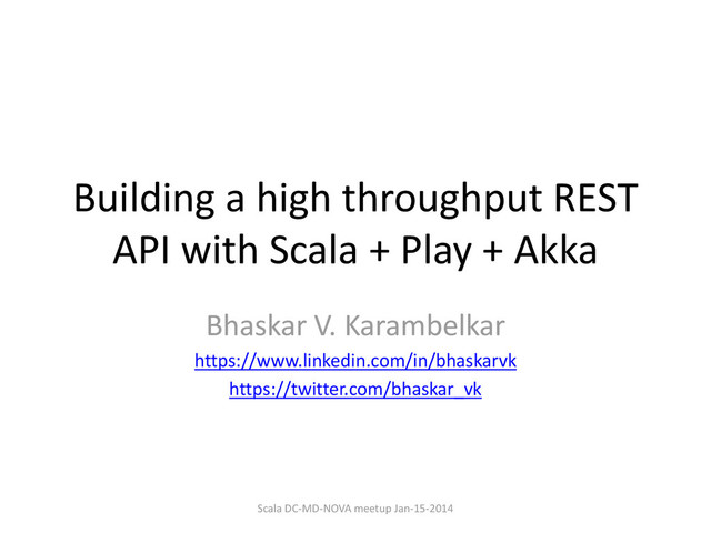 that could successfully tackle the 4 Vs of Big Data viz. Volume, Velocity, Variety, Veracity. • Needed the API to be horizontally as well as vertically scalable. • Needed an “event driven” architecture/ programming model. • Needed easy “HA”, “fail-over”, “concurrency”, “load balancing” constructs. Scala DC-MD-NOVA meetup Jan-15-2014