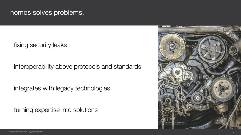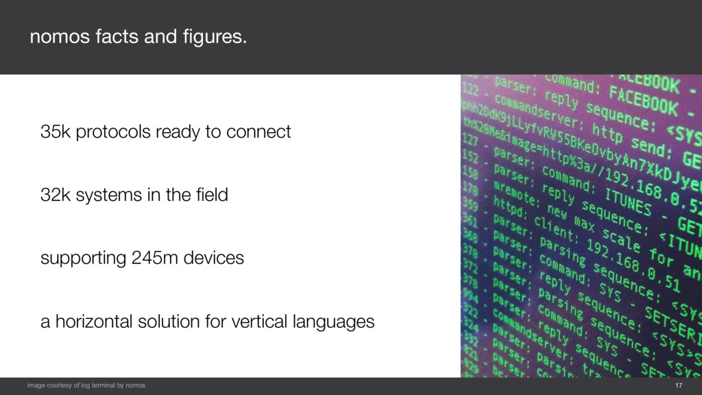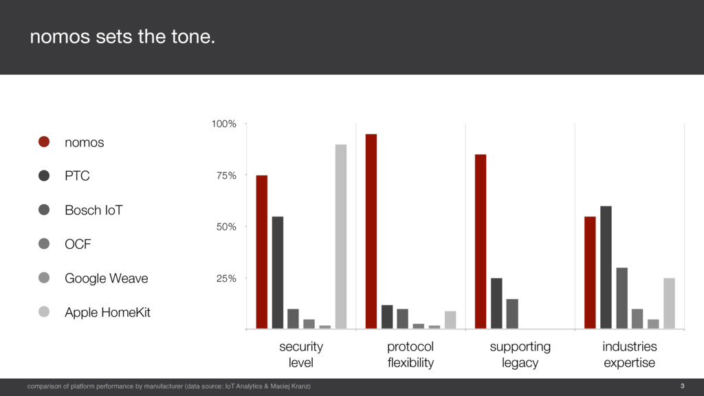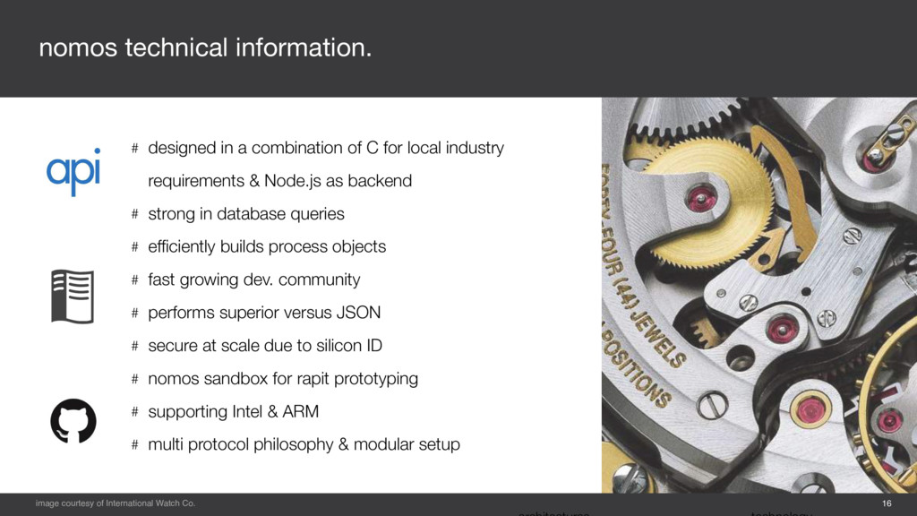 Co. # designed in a combination of C for local industry requirements & Node.js as backend # strong in database queries # efficiently builds process objects # fast growing dev. community # performs superior versus JSON # secure at scale due to silicon ID # nomos sandbox for rapit prototyping # supporting Intel & ARM # multi protocol philosophy & modular setup