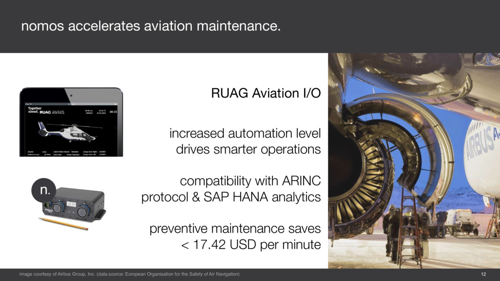 automation level drives smarter operations image courtesy of Airbus Group, Inc. (data source: European Organisation for the Safety of Air Navigation) nomos accelerates aviation maintenance. preventive maintenance saves < 17.42 USD per minute RUAG Aviation I/O 12
