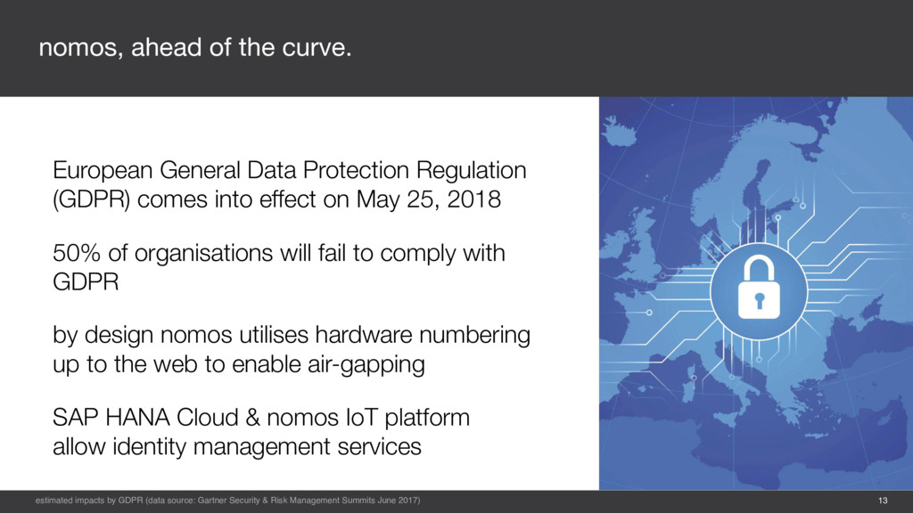 Risk Management Summits June 2017) nomos, ahead of the curve. 13 European General Data Protection Regulation (GDPR) comes into effect on May 25, 2018 50% of organisations will fail to comply with GDPR by design nomos utilises hardware numbering up to the web to enable air-gapping SAP HANA Cloud & nomos IoT platform allow identity management services