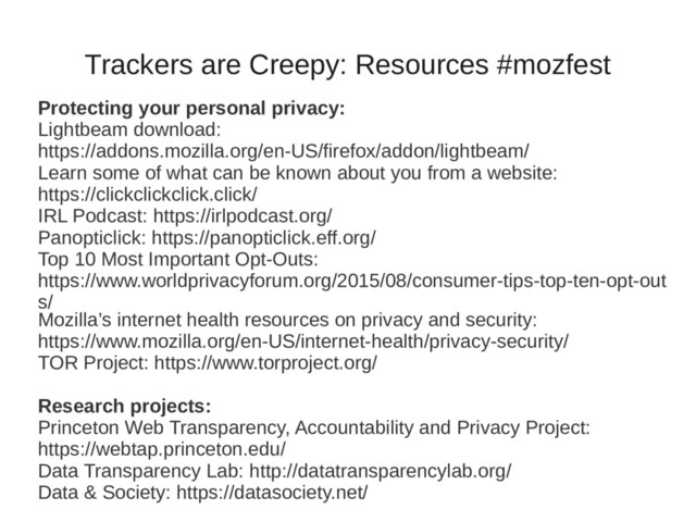download: https://addons.mozilla.org/en-US/firefox/addon/lightbeam/ Learn some of what can be known about you from a website: https://clickclickclick.click/ IRL Podcast: https://irlpodcast.org/ Panopticlick: https://panopticlick.eff.org/ Top 10 Most Important Opt-Outs: https://www.worldprivacyforum.org/2015/08/consumer-tips-top-ten-opt-out s/ Mozilla’s internet health resources on privacy and security: https://www.mozilla.org/en-US/internet-health/privacy-security/ TOR Project: https://www.torproject.org/ Research projects: Princeton Web Transparency, Accountability and Privacy Project: https://webtap.princeton.edu/ Data Transparency Lab: http://datatransparencylab.org/ Data & Society: https://datasociety.net/