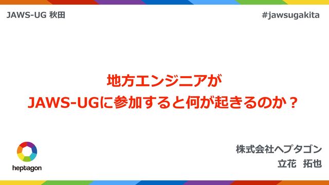 株式会社ヘプタゴン ⽴花 拓也 地⽅エンジニアが JAWS-UGに参加すると何が起きるのか? JAWS-UG 秋⽥ #jawsugakita