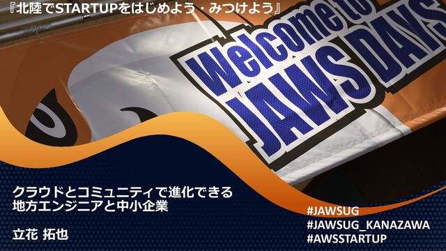 https://jawsug-kanazawa.doorkeeper.jp/events/159890 2023年12月9月 JAWS-UG金沢 x AWS Startup Community プレゼンツ『北陸でStartupをはじめよう・みつけよう』