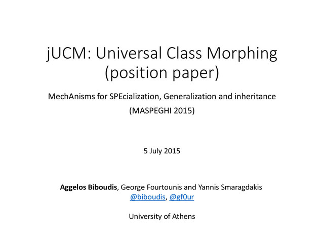 Dissect the syntax through an example • A casual discussion about the type system 2. Introducing Universal Class Morphing • A walk through the idea via examples, examples, examples 3. Research challenges University of Athens 2 5/7/2015