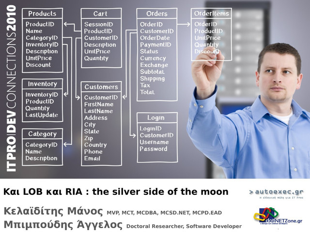 Visual Studio 2010 • RIA Services Toolkit – Endpoints – ASP.NET Support – Client tools for proxies • Domain Services – DAL agnostic • For free: – Domain context – Change tracking, paging, sorting, filtering of entities – Service & Entity level validation – Shared code – Membership & Authentication support Που είναι ο λάκκος; • magic code generation • Αόρατα services • Κάντο όπως το θέλουν