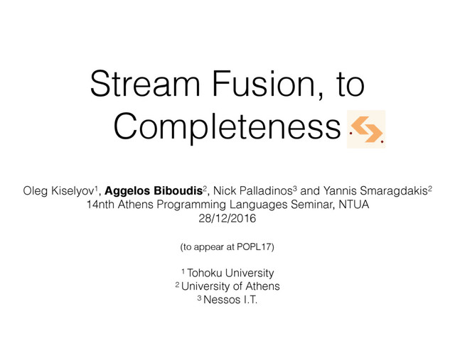 Presentation of Stream Fusion, to Completeness at the local, annual, Athens PL Seminar organized by Nick Papaspyrou, Kostis Sagonas and Stathes Zachos at NTUA.
