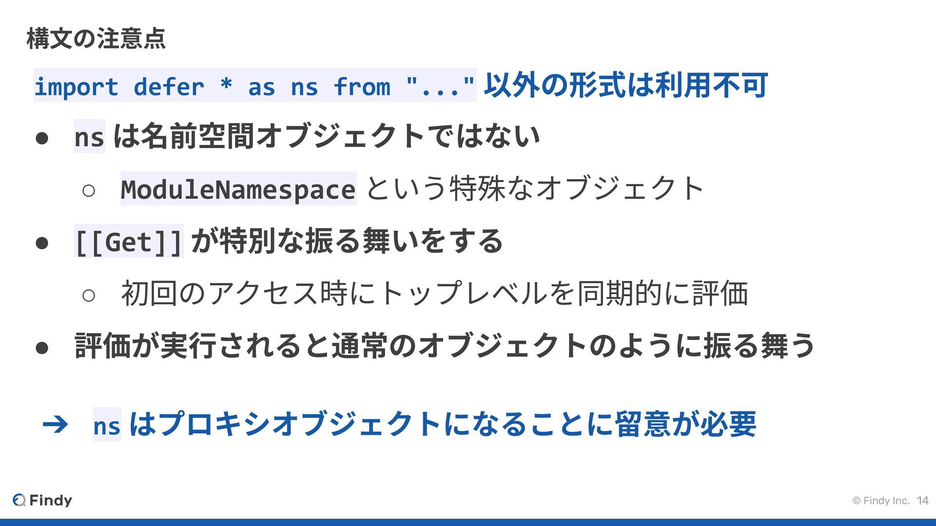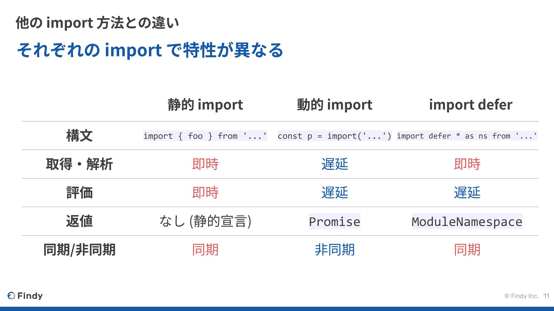 TC39 Stage 3の提案であるこの機能は、モジュールの「取得・解析」を即座に行う一方で、トップレベルの「評価(実行)」を実際にプロパティにアクセスする瞬間まで遅延させるものです。これにより、従来の動的import(dynamic import)のように非同期処理(Promise)を扱う複雑さを避けつつ、同期的な構文のままで初期ロード時のCPUコスト(TBT)を削減できる利点を紹介しています。