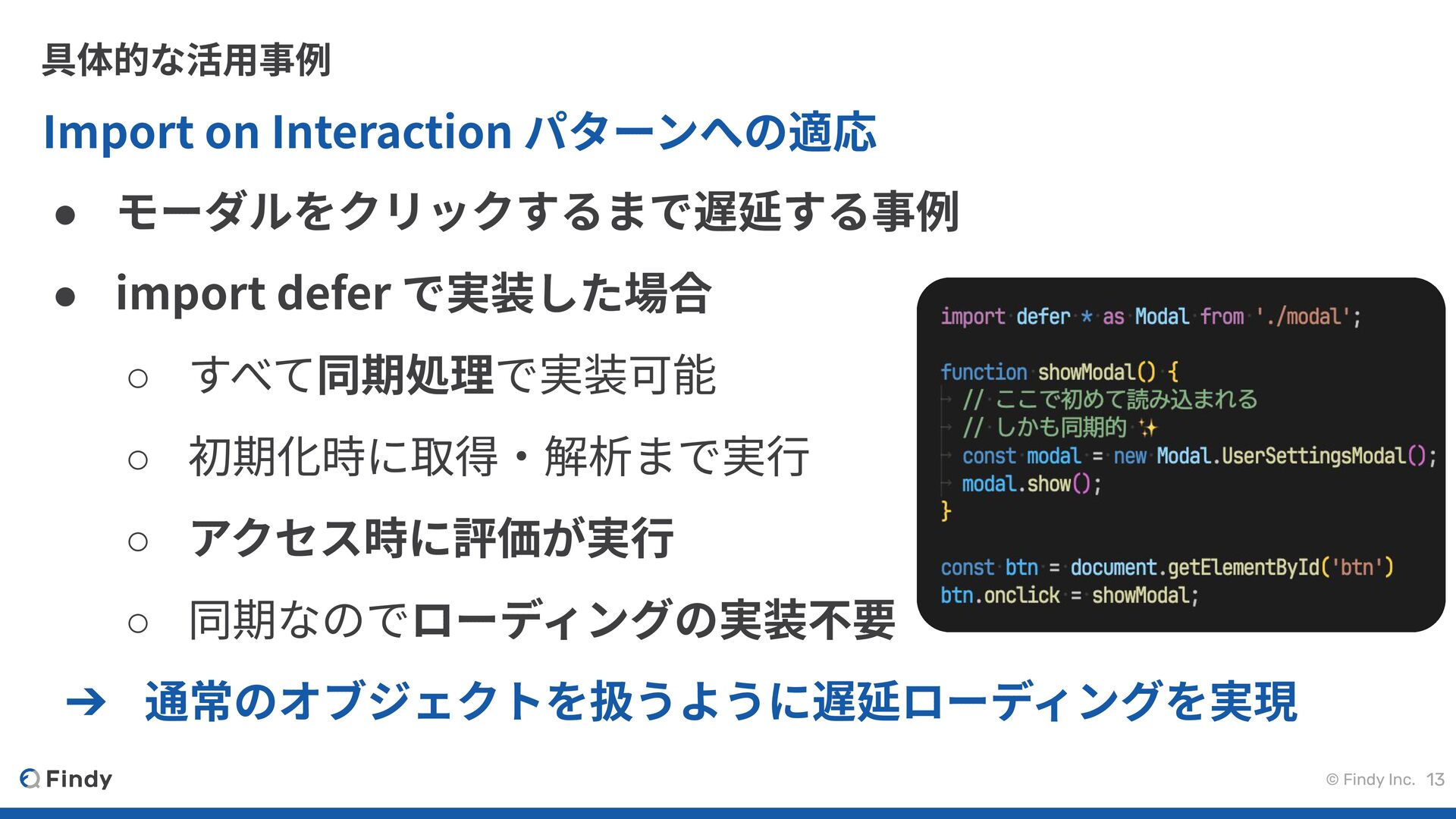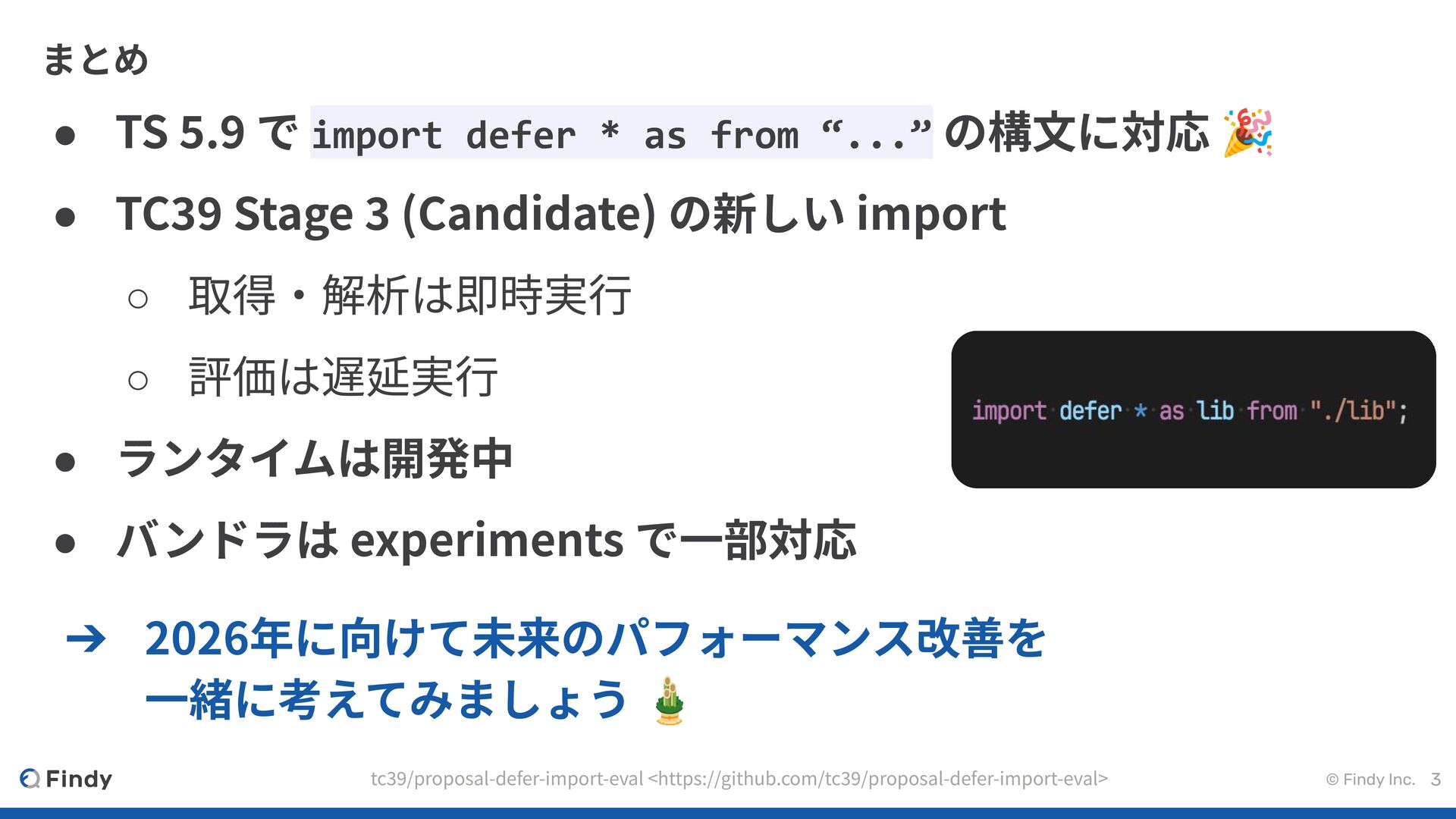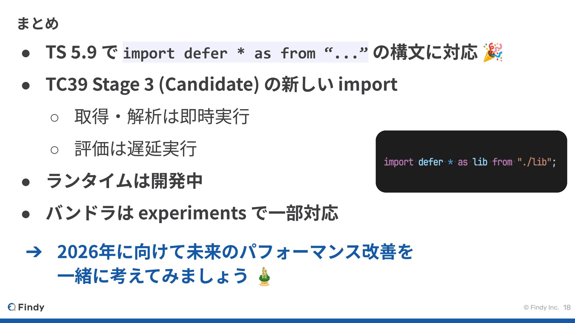 具体的な活用例として、モーダルのような「ユーザー操作時に初めて必要となる機能」の評価を遅らせるパターンを紹介しています。また、利用にはtsconfig.jsonの設定変更が必要であり、現時点でランタイムやバンドラは実験的な対応にとどまる点にも言及しつつ、2026年に向けた未来のパフォーマンス改善を一緒に考えようと呼びかけています。