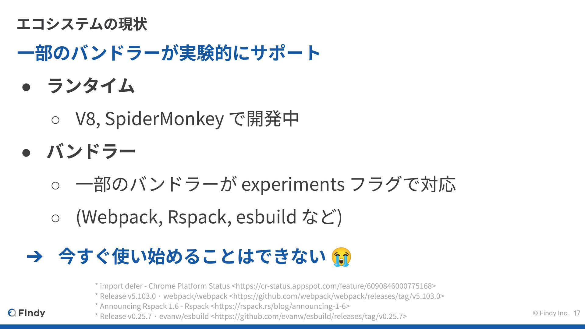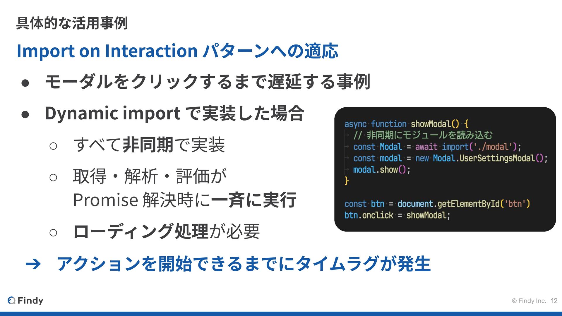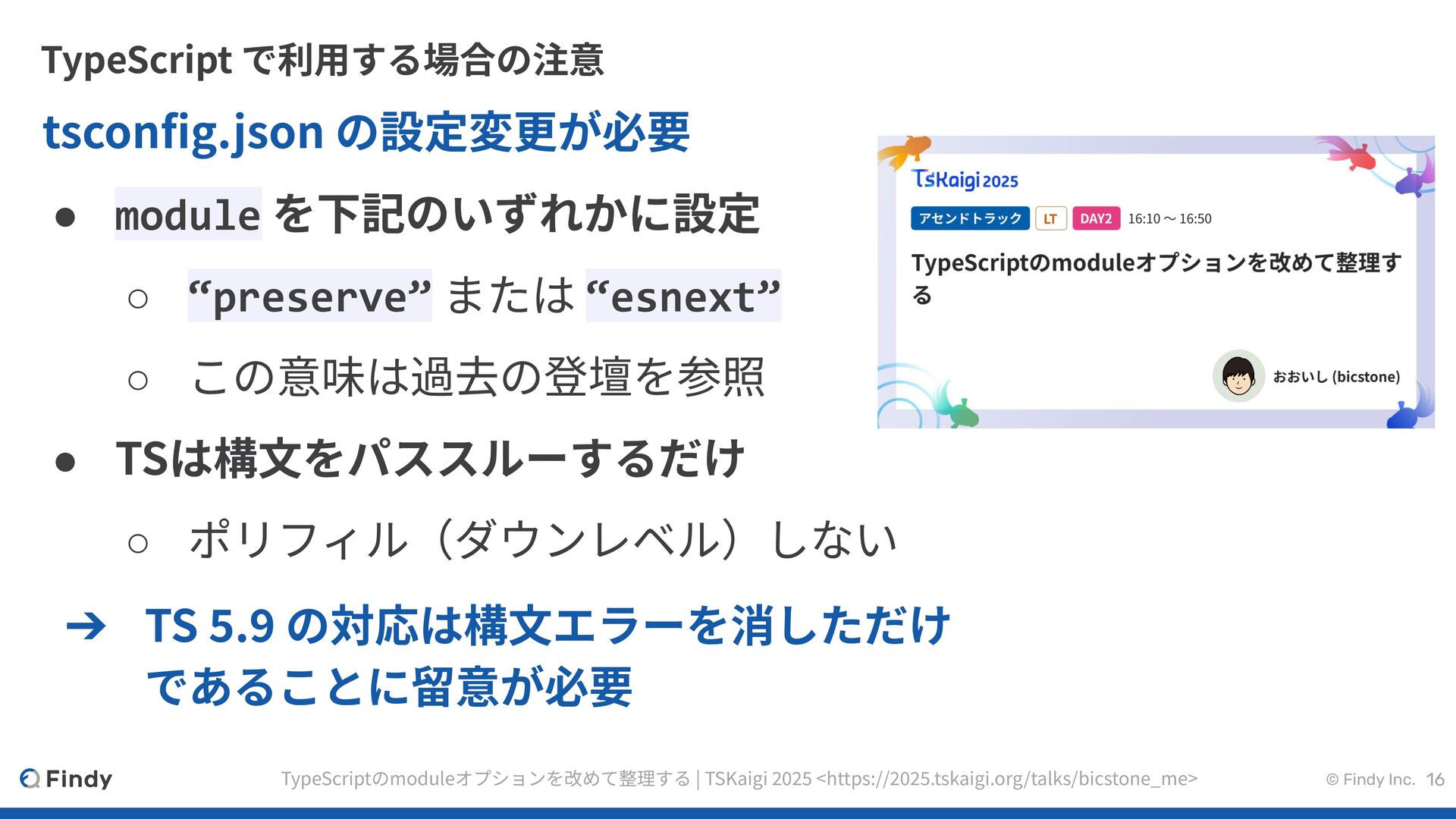 具体的な活用例として、モーダルのような「ユーザー操作時に初めて必要となる機能」の評価を遅らせるパターンを紹介しています。また、利用にはtsconfig.jsonの設定変更が必要であり、現時点でランタイムやバンドラは実験的な対応にとどまる点にも言及しつつ、2026年に向けた未来のパフォーマンス改善を一緒に考えようと呼びかけています。