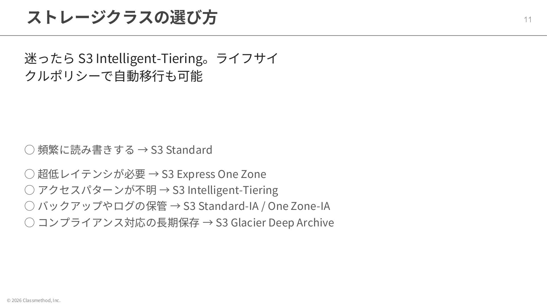 © 2026 Classmethod, Inc. ストレージクラスの選び方 11 迷ったら S3 Intelligent-Tiering。ライフサイ クルポリシーで自動移行も可能