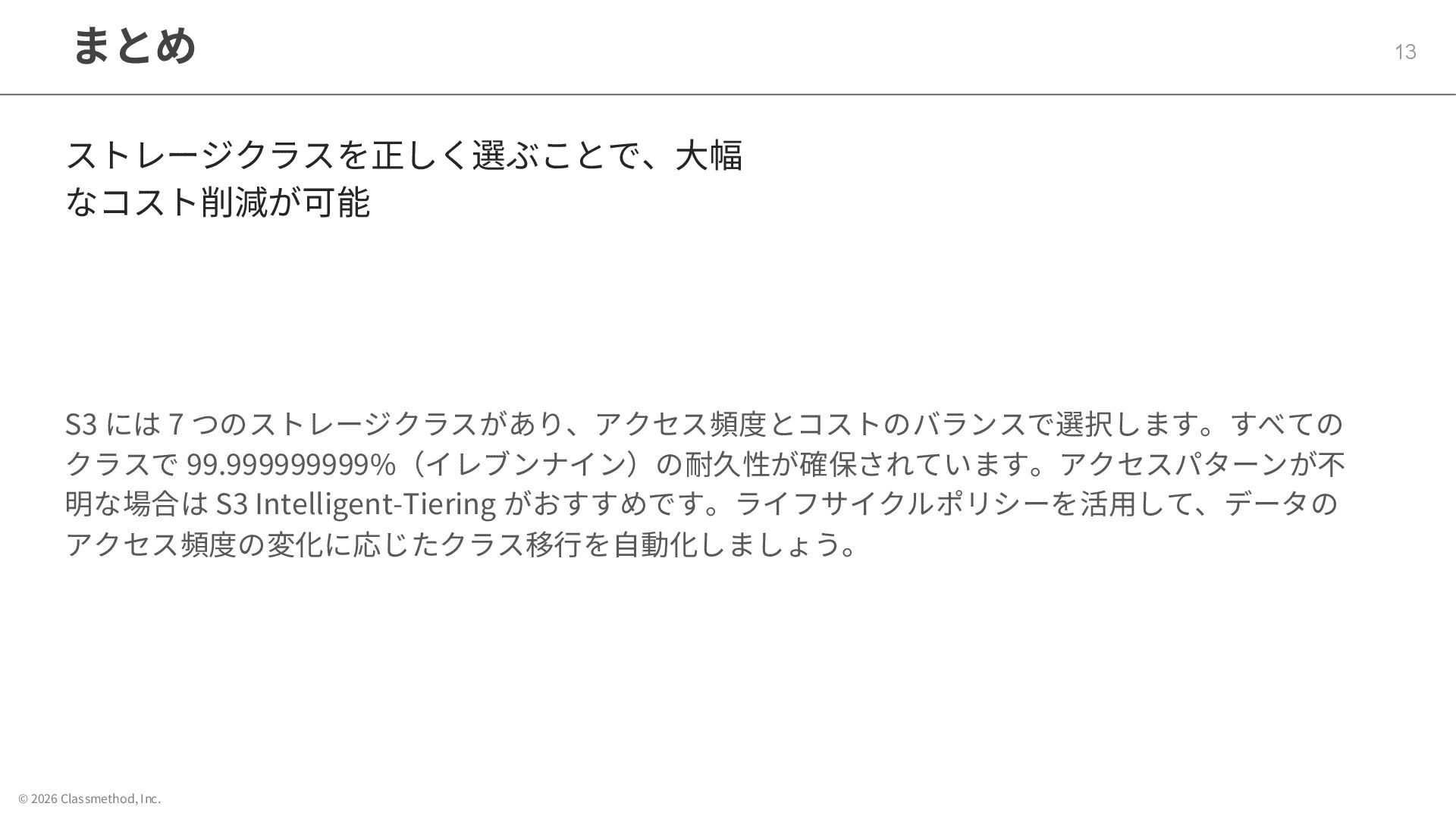 © 2026 Classmethod, Inc. まとめ 13 ストレージクラスを正しく選ぶことで、大幅 なコスト削減が可能 S3 には