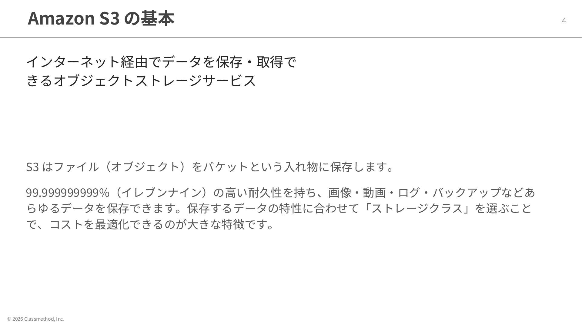 © 2026 Classmethod, Inc. Amazon S3 の基本 4 インターネット経由でデータを保存・取得で きるオブジェクトストレージサービス