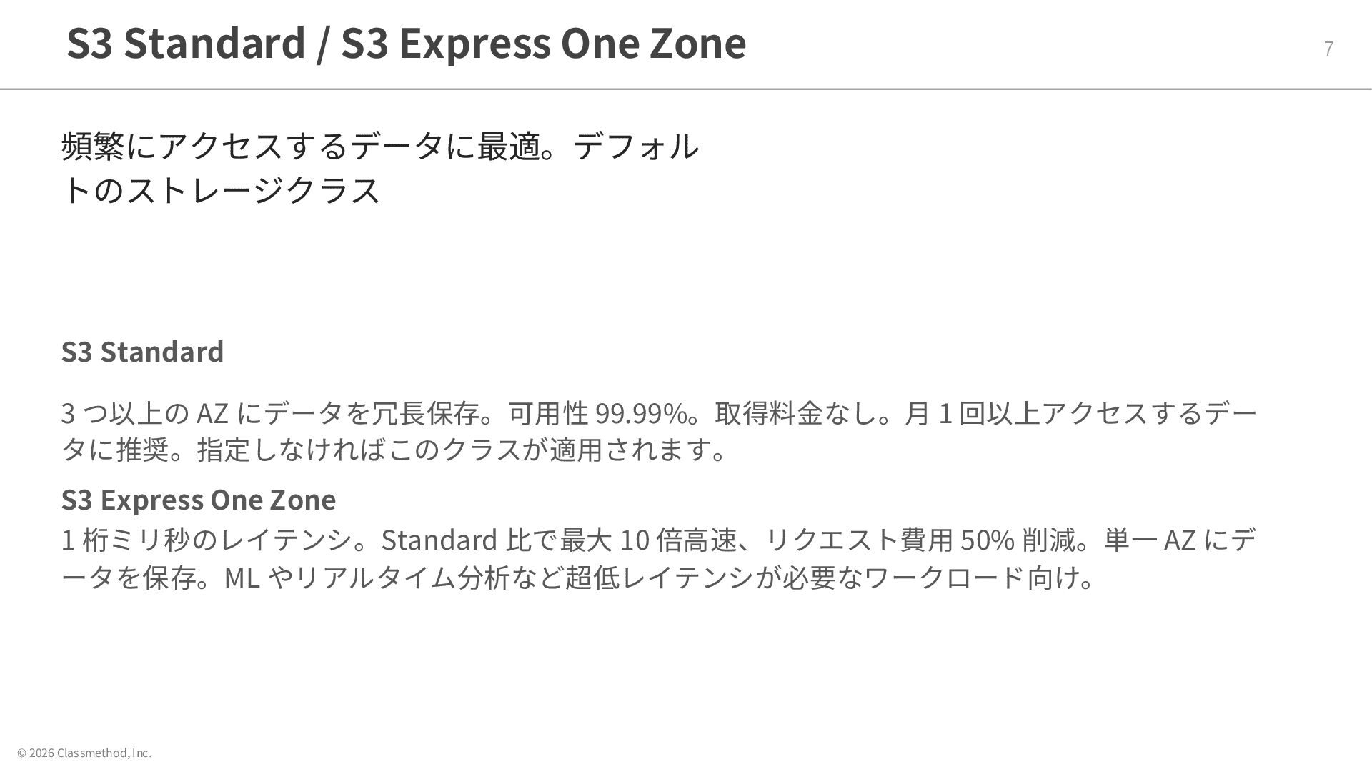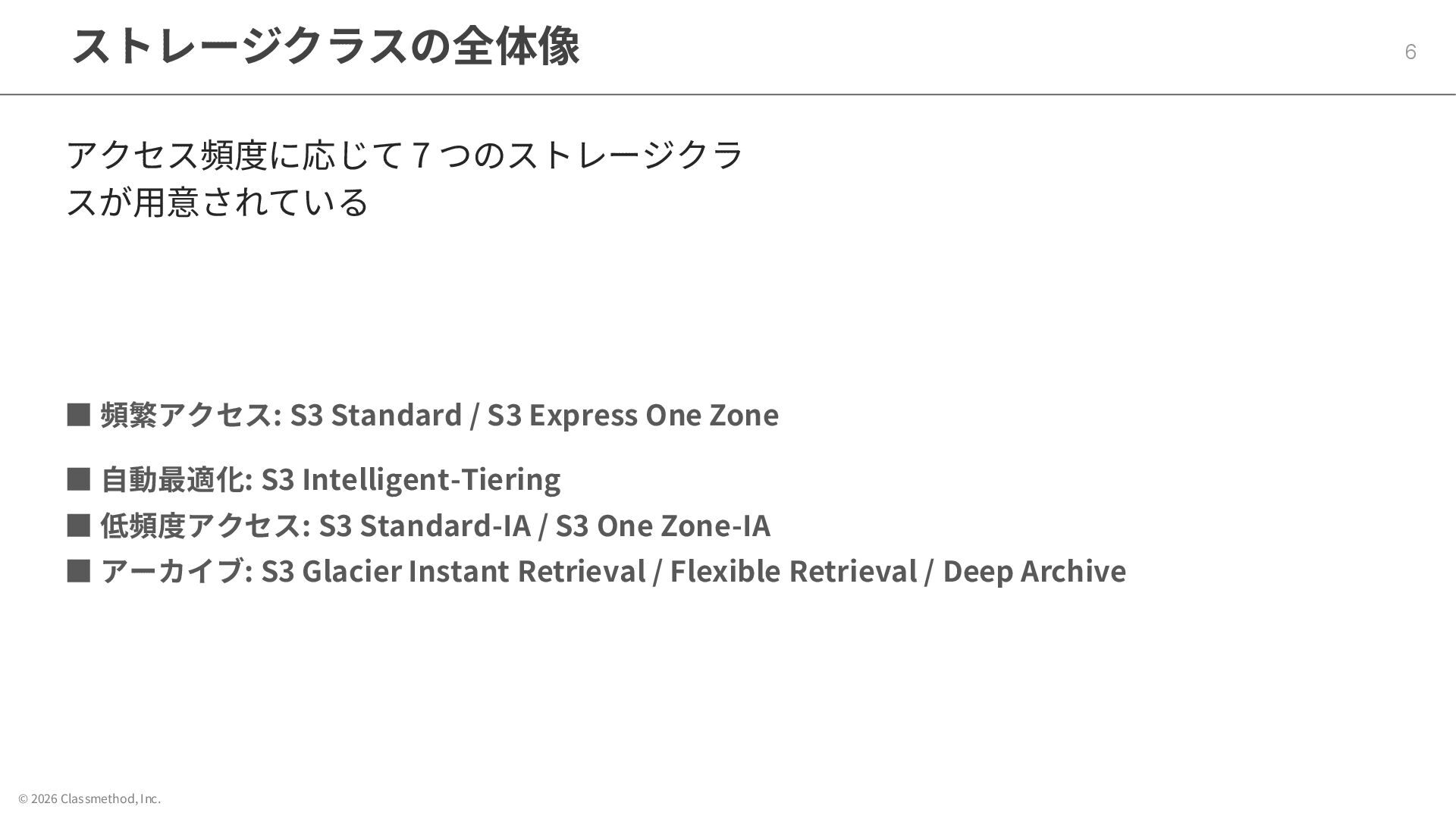 © 2026 Classmethod, Inc. ストレージクラスの全体像 6 アクセス頻度に応じて 7 つのストレージクラ スが用意されている