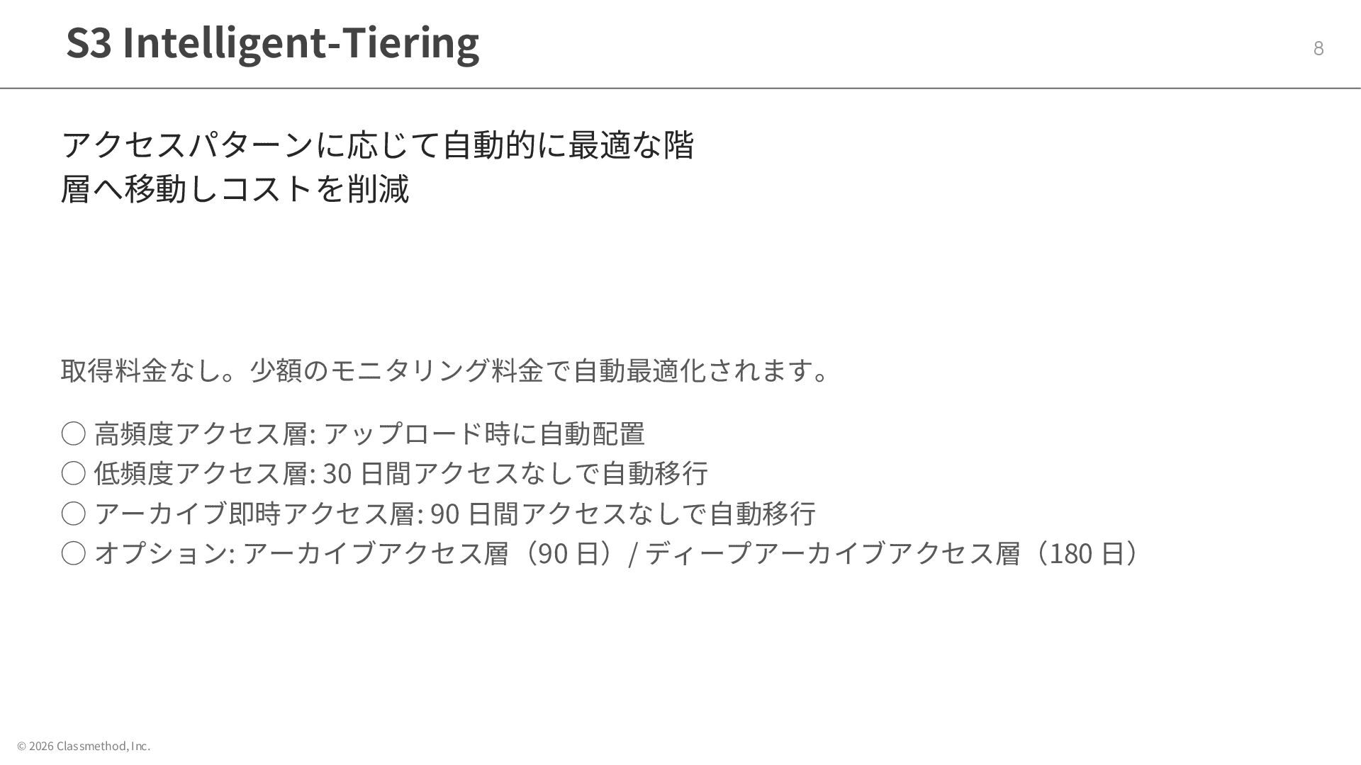 © 2026 Classmethod, Inc. S3 Intelligent-Tiering 8 アクセスパターンに応じて自動的に最適な階 層へ移動しコストを削減 取得料金なし。少額のモニタリング料金で自動最適化されます。