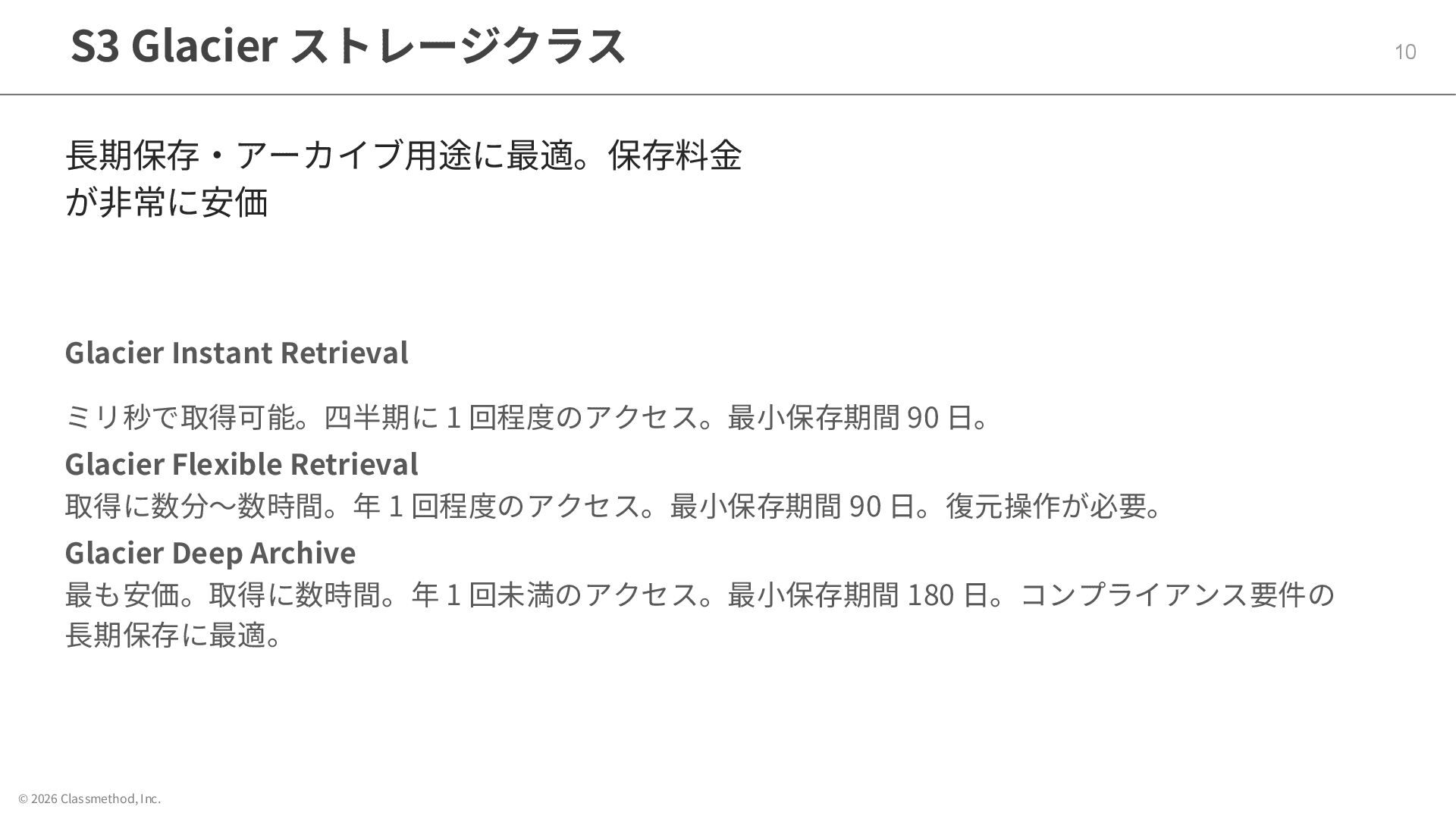 © 2026 Classmethod, Inc. S3 Glacier ストレージクラス 10 長期保存・アーカイブ用途に最適。保存料金 が非常に安価