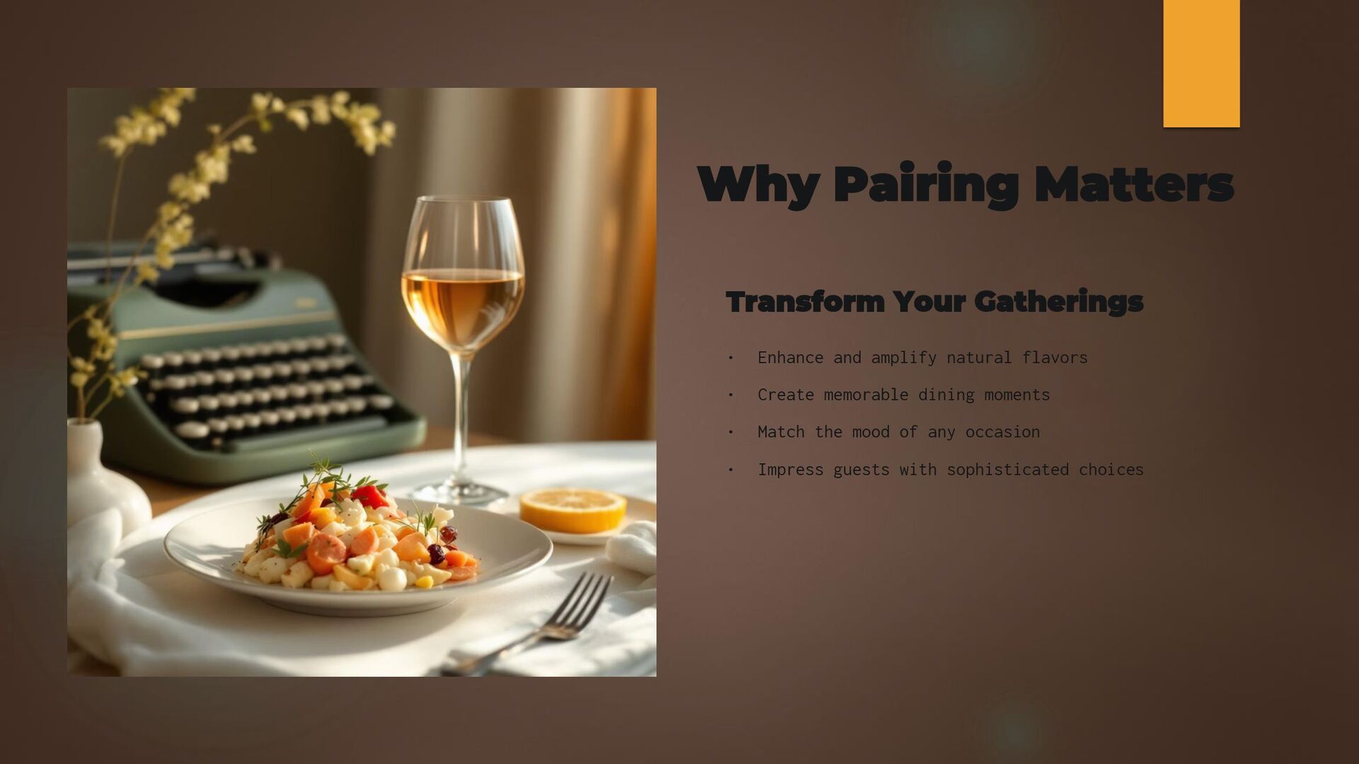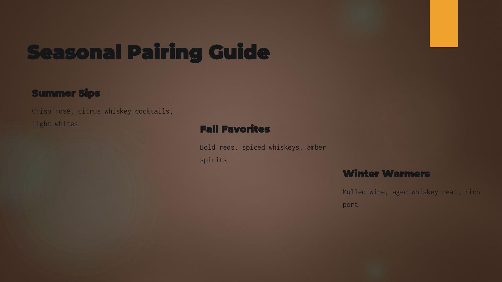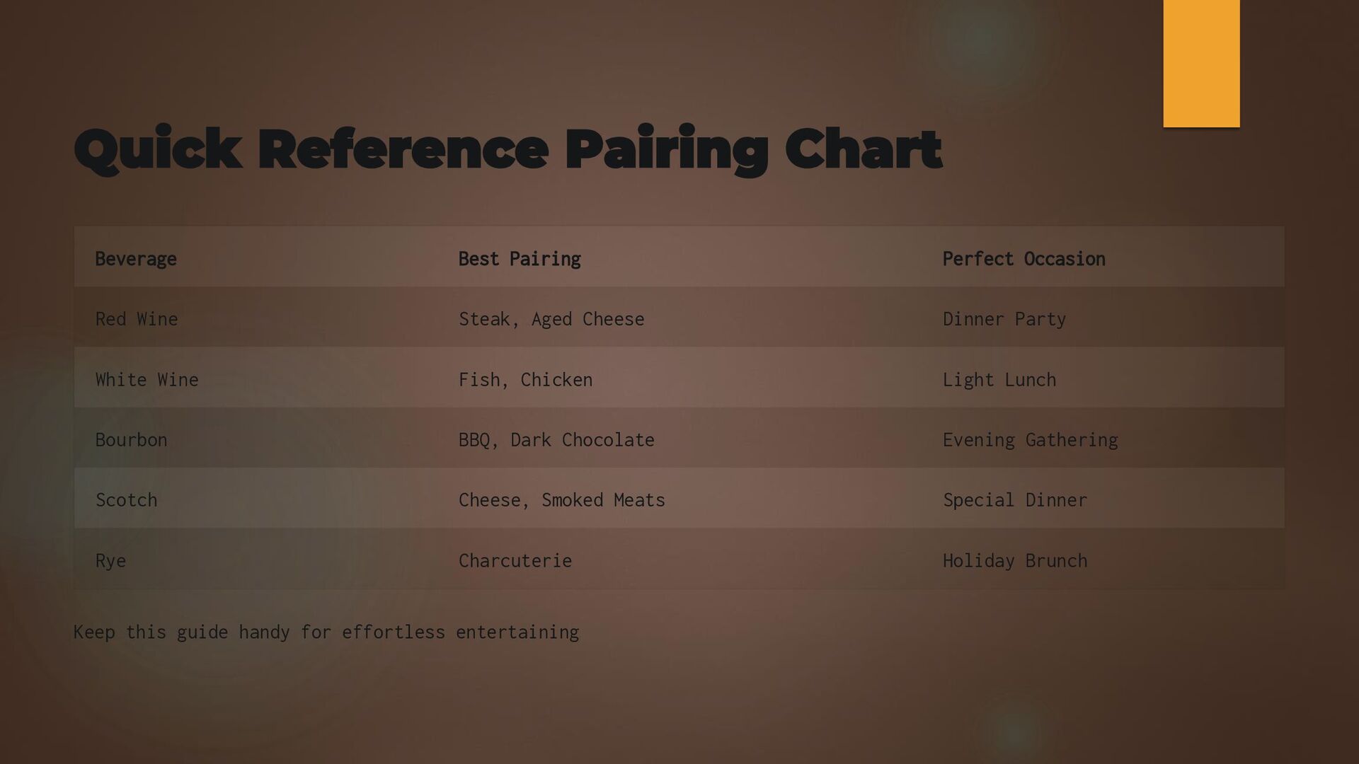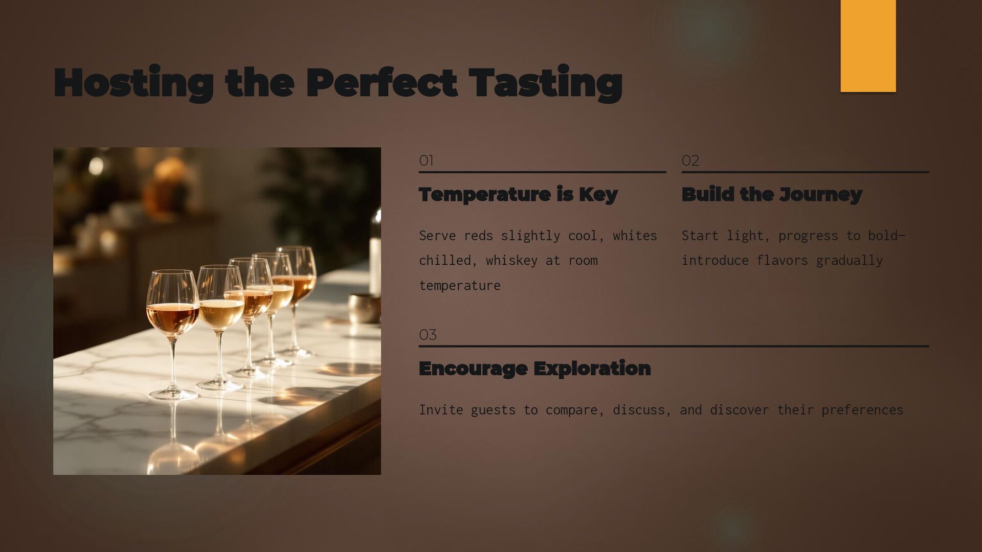 One of the most important skills in mixology is understanding balance. This presentation teaches the core elements of flavor—sweet, sour, bitter, strong, and sometimes umami—and how they interact in a cocktail. It introduces the golden ratio (2:1:0.5) as a reliable structure for most drinks while emphasizing that taste testing and adjustment are key to excellence. The guide explains how simple syrup, citrus, bitters, and spirits work together to create harmony. It also explores how temperature, dilution, and texture influence flavor. By learning to balance these factors, home bartenders can elevate even basic recipes and start designing their own. Mastering balance separates average drinks from unforgettable creations. This section empowers users with the confidence to refine each cocktail until it reaches smooth, flavorful perfection.