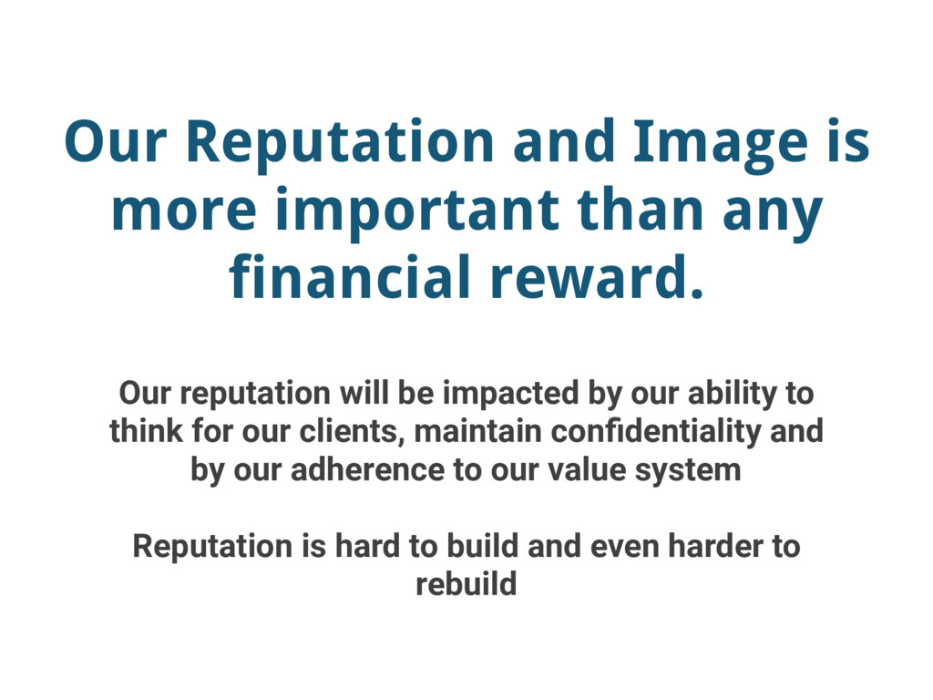 reward. Our reputation will be impacted by our ability to think for our clients, maintain confidentiality and by our adherence to our value system Reputation is hard to build and even harder to rebuild
