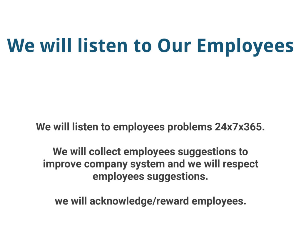 employees problems 24x7x365. We will collect employees suggestions to improve company system and we will respect employees suggestions. we will acknowledge/reward employees.