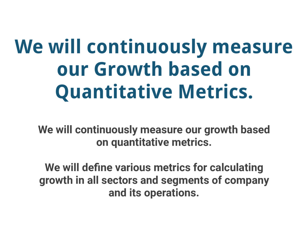 We will continuously measure our growth based on quantitative metrics. We will define various metrics for calculating growth in all sectors and segments of company and its operations.