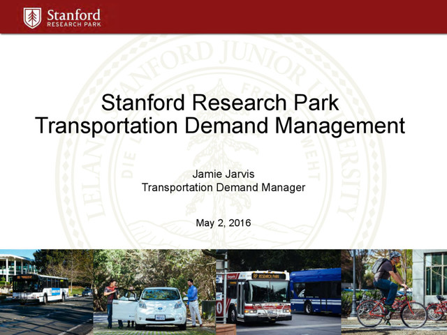 Presented by Jamie Jarvis, Transportation Demand Manager for Stanford Research Park to Moving on Mobility: Last Mile Transportation Solutions at Stanford University on May 2, 2016. Organized by the Bill Lane Center for the American West, Stanford Public Policy , the Precourt Institute for Energy and Joint Venture Silicon Valley.