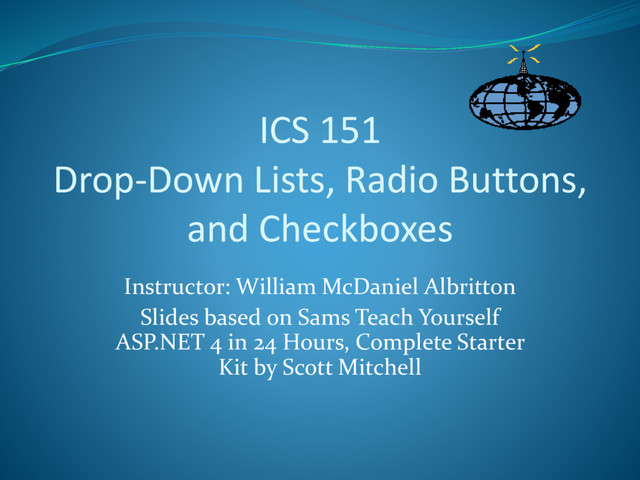 control 1. After creating assignment9.aspx web page, type in a question, such as “What is your favorite sushi?” 2. Click on Toolbox window, Standard category 3. Click on DropDownList, and drag it to the web page, inside the <form> element 4. Add a Button Web control inside the <form> element 5. Add a Label Web control inside the <form> element, and delete the property/value pair Text="Label"