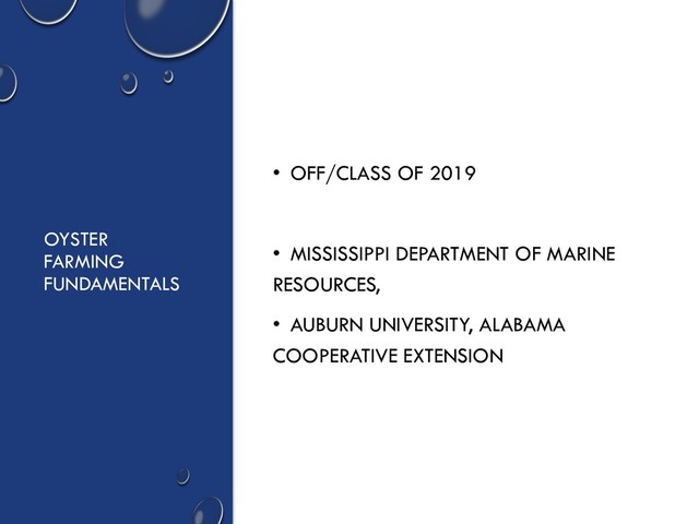 Nursery Options Class Three – Operating an Oyster Farm • Storm Preparation • Mitigating Hazards • Inventory Management • Harvest Requirements • Protecting Public Health Class Four – Operating an Oyster Farm