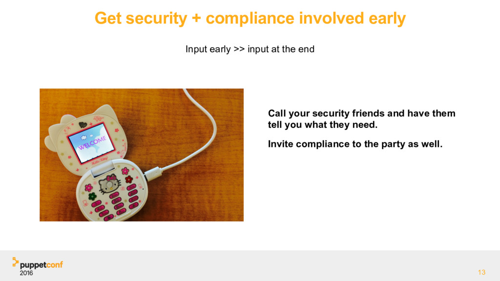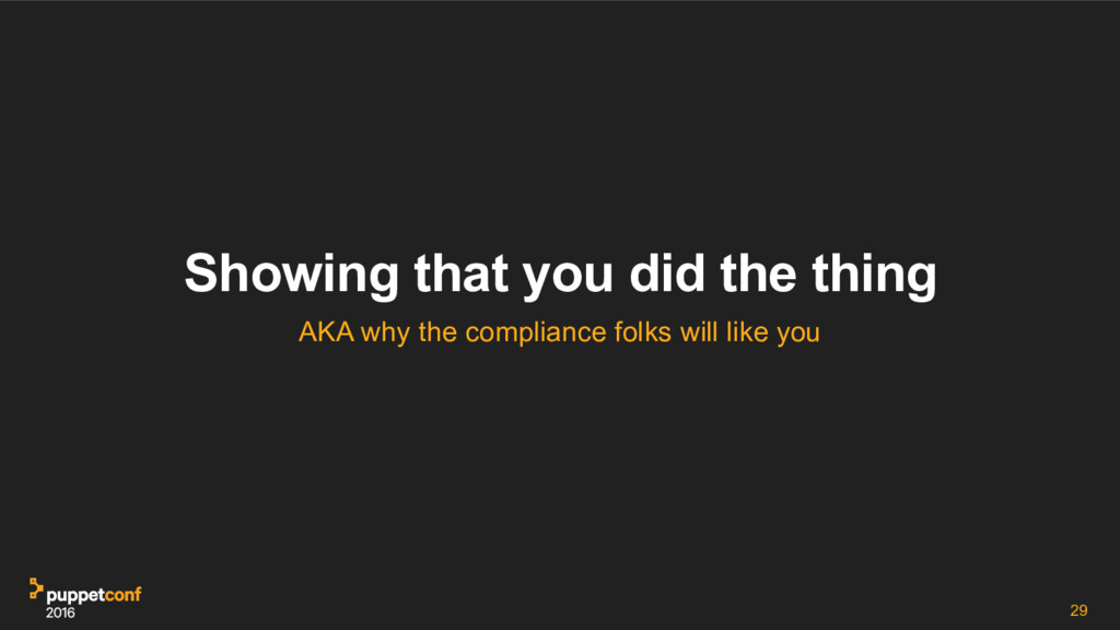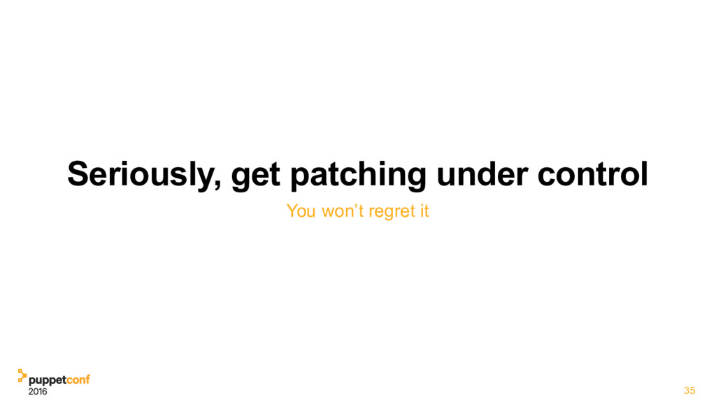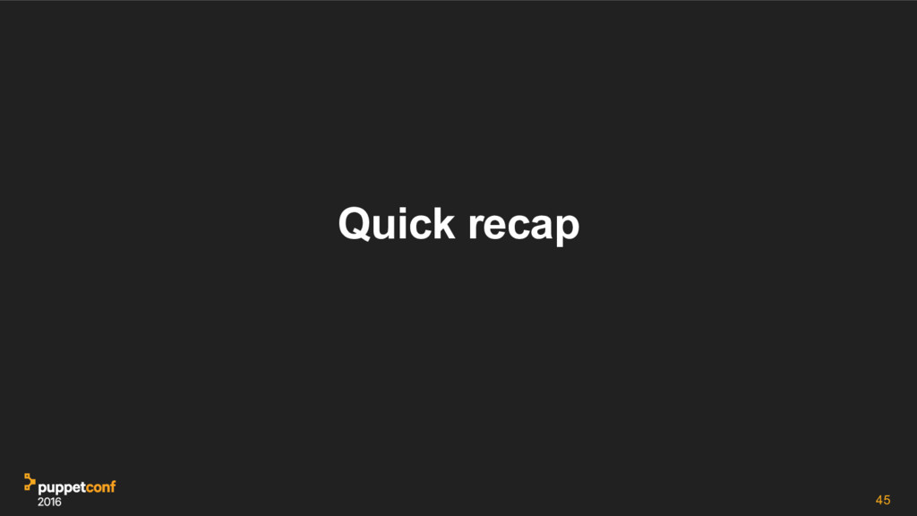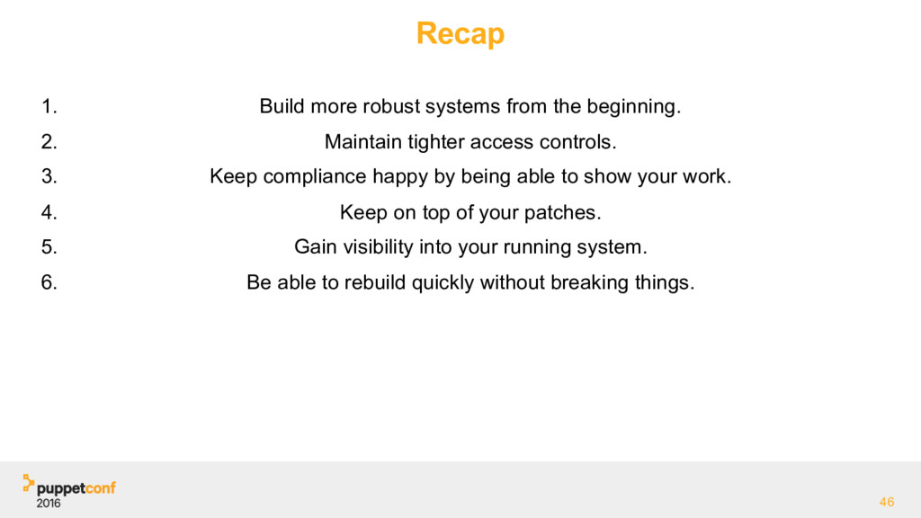 tighter access controls. 3. Keep compliance happy by being able to show your work. 4. Keep on top of your patches. 5. Gain visibility into your running system. 6. Be able to rebuild quickly without breaking things. 46 Recap