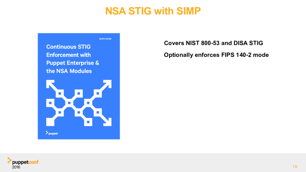 acronym. NSA: National Security Agency STIG: Secure Technical Implementation Guide SIMP: System Integrity Management Platform 18 WHITE PAPER Continuous STIG Enforcement with Puppet Enterprise & the NSA Modules