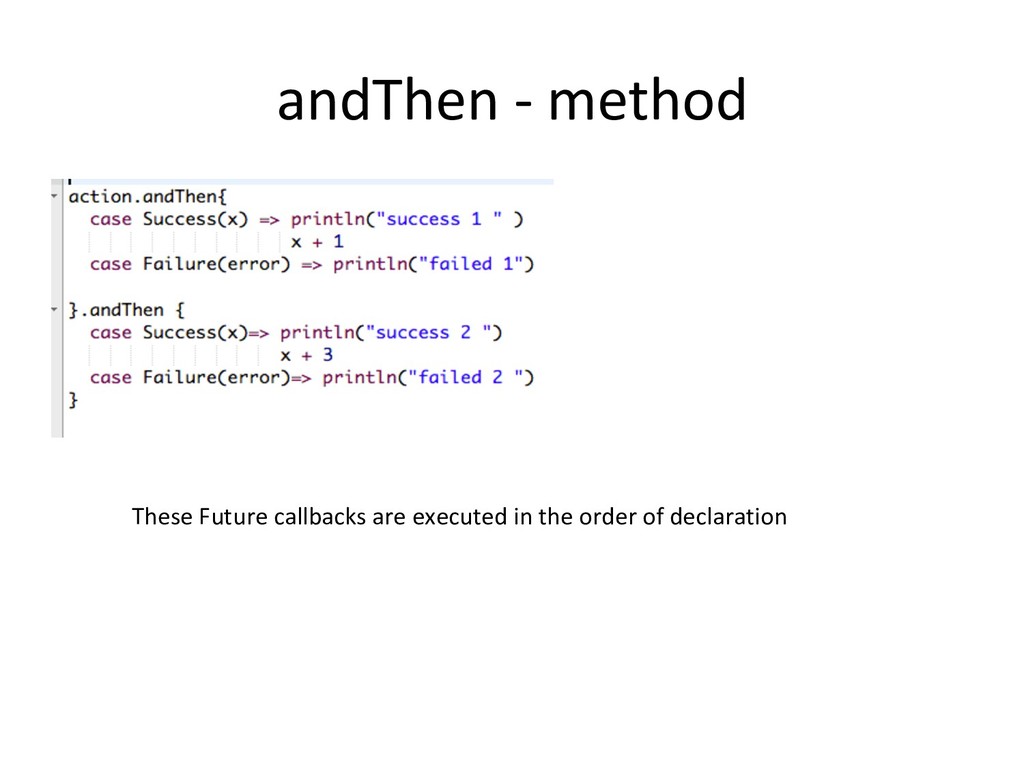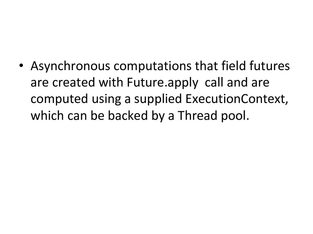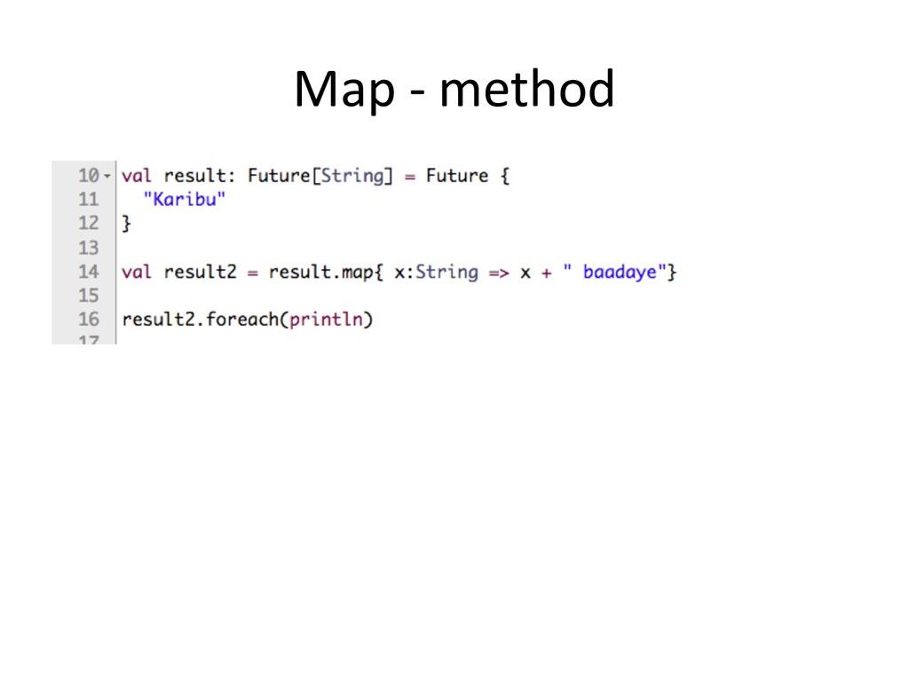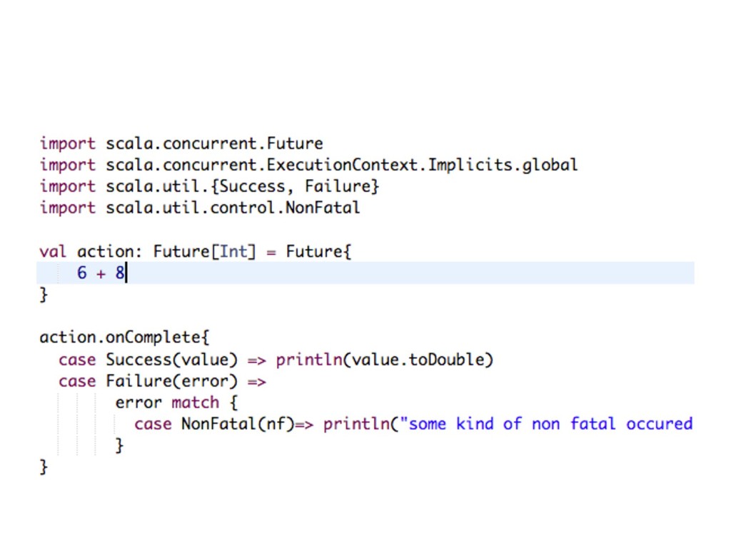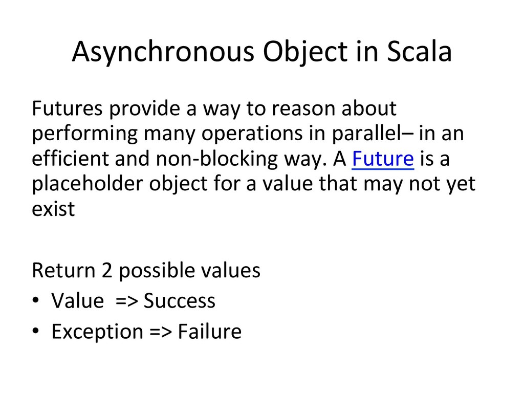 about performing many operations in parallel– in an efficient and non-blocking way. A Future is a placeholder object for a value that may not yet exist Return 2 possible values • Value => Success • Exception => Failure