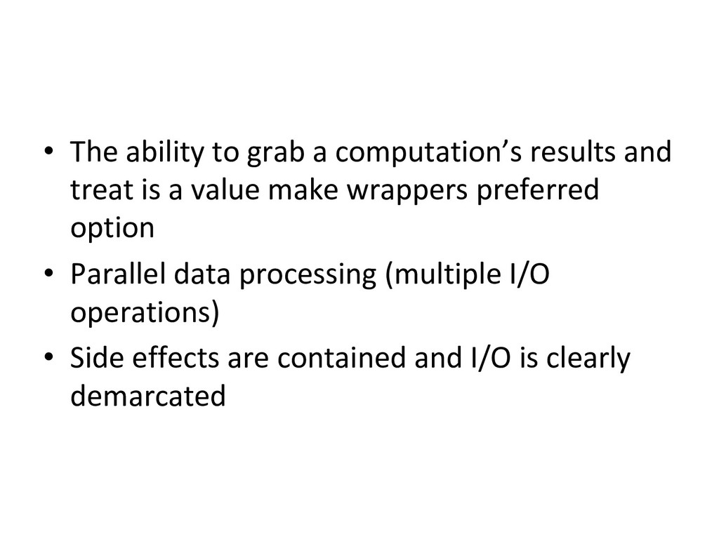 is a value make wrappers preferred option • Parallel data processing (multiple I/O operations) • Side effects are contained and I/O is clearly demarcated
