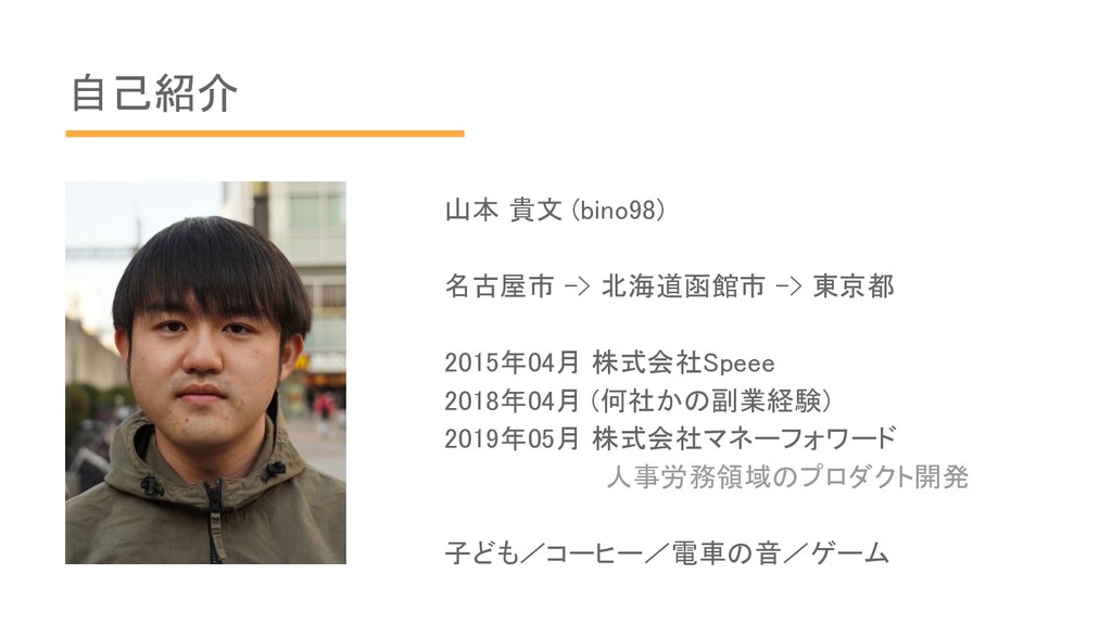 2015年04月 株式会社Speee 2018年04月 (何社かの副業経験) 2019年05月 株式会社マネーフォワード 人事労務領域のプロダクト開発 子ども/コーヒー/電車の音/ゲーム