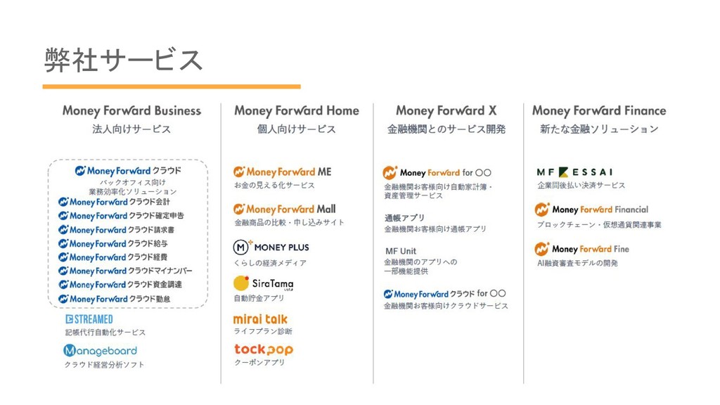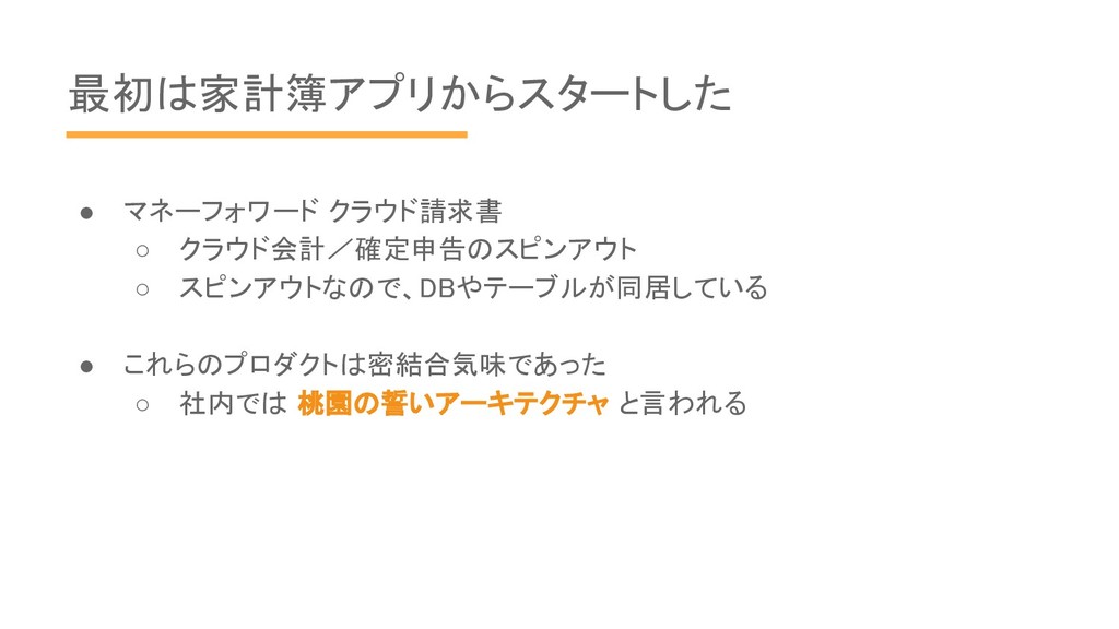 最初は家計簿アプリからスタートした • マネーフォワード クラウド請求書 ◦ クラウド会計/確定申告のスピンアウト ◦ スピンアウトなので、DBやテーブルが同居している •