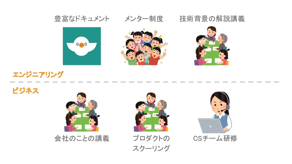 ビジネス エンジニアリング 豊富なドキュメント メンター制度 技術背景の解説講義 会社のことの講義 プロダクトの スクーリング CSチーム研修
