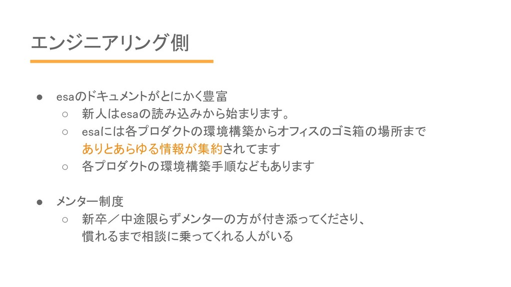 エンジニアリング側 • esaのドキュメントがとにかく豊富 ◦ 新人はesaの読み込みから始まります。 ◦ esaには各プロダクトの環境構築からオフィスのゴミ箱の場所まで ありとあらゆる情報が集約されてます ◦ 各プロダクトの環境構築手順などもあります