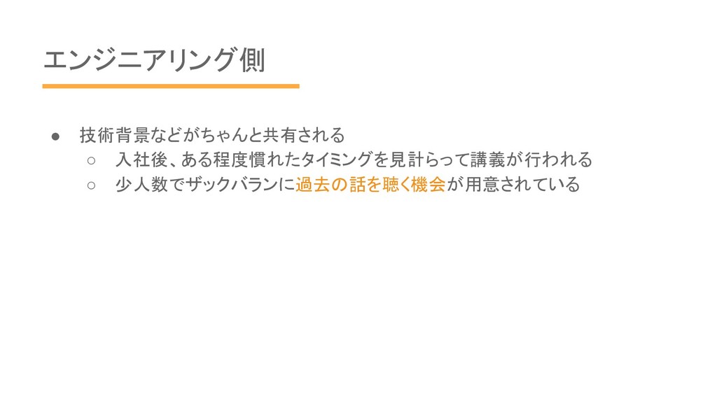 エンジニアリング側 • 技術背景などがちゃんと共有される ◦ 入社後、ある程度慣れたタイミングを見計らって講義が行われる ◦ 少人数でザックバランに過去の話を聴く機会が用意されている