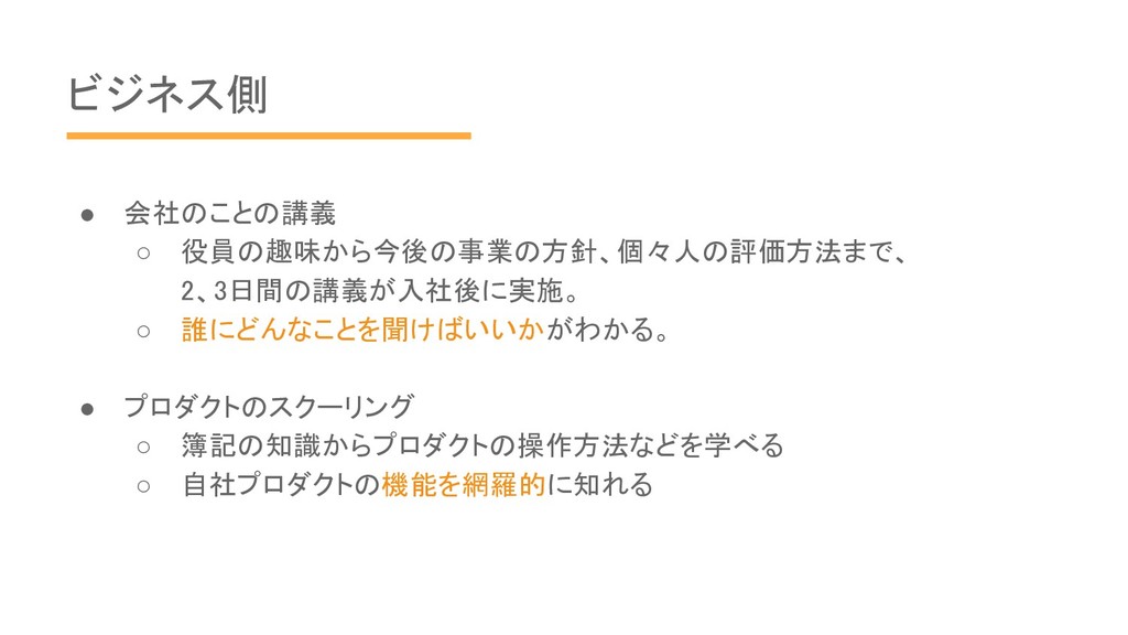 ビジネス側 • 会社のことの講義 ◦ 役員の趣味から今後の事業の方針、個々人の評価方法まで、 2、3日間の講義が入社後に実施。 ◦ 誰にどんなことを聞けばいいかがわかる。 •