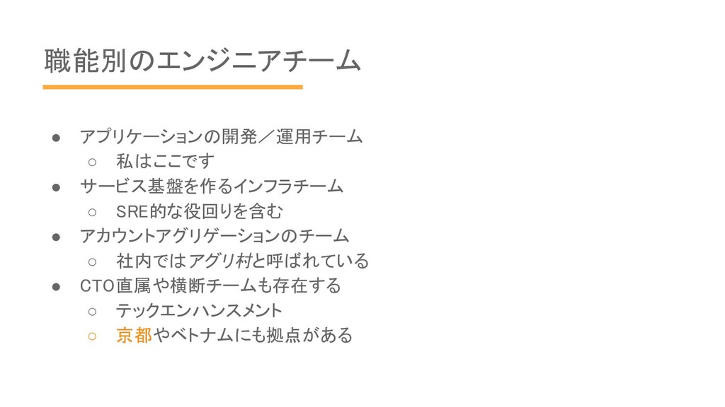 アカウントアグリゲーションのチーム ◦ 社内ではアグリ村と呼ばれている • CTO直属や横断チームも存在する ◦ テックエンハンスメント ◦ 京都やベトナムにも拠点がある
