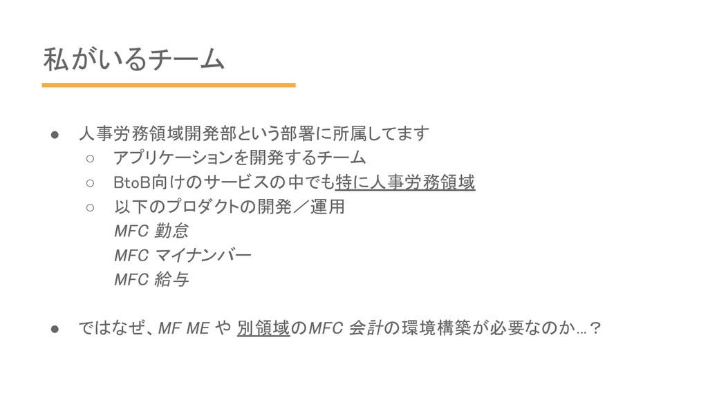 私がいるチーム • 人事労務領域開発部という部署に所属してます ◦ アプリケーションを開発するチーム ◦ BtoB向けのサービスの中でも特に人事労務領域 ◦ 以下のプロダクトの開発/運用 MFC