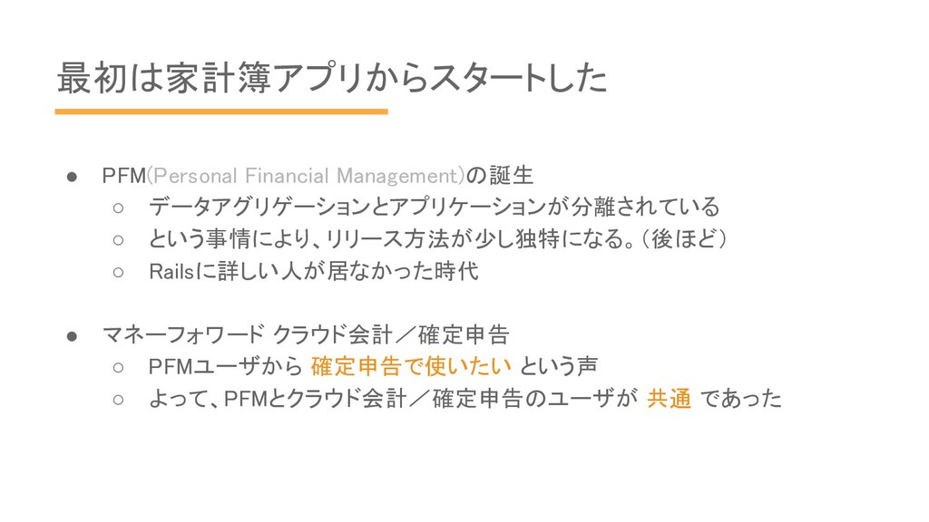 Railsに詳しい人が居なかった時代 • マネーフォワード クラウド会計/確定申告 ◦ PFMユーザから 確定申告で使いたい という声 ◦ よって、PFMとクラウド会計/確定申告のユーザが 共通 であった