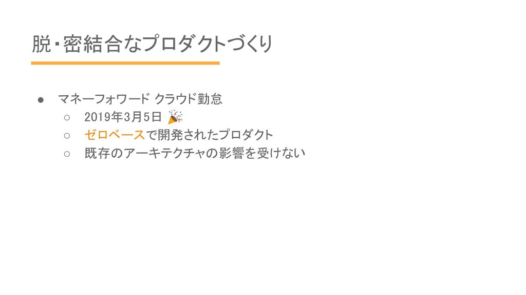 脱・密結合なプロダクトづくり • マネーフォワード クラウド勤怠 ◦ 2019年3月5日 ◦ ゼロベースで開発されたプロダクト ◦