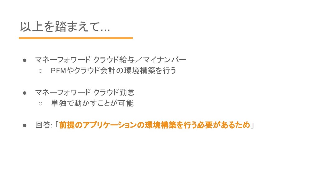 以上を踏まえて... • マネーフォワード クラウド給与/マイナンバー ◦ PFMやクラウド会計の環境構築を行う • マネーフォワード クラウド勤怠