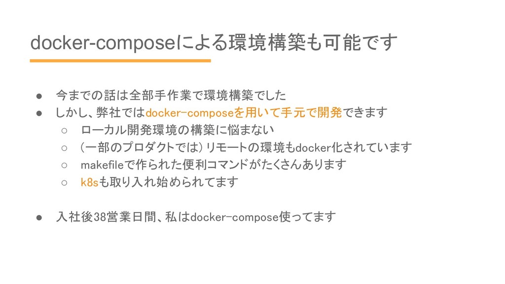 ◦ makefileで作られた便利コマンドがたくさんあります ◦ k8sも取り入れ始められてます • 入社後38営業日間、私はdocker-compose使ってます
