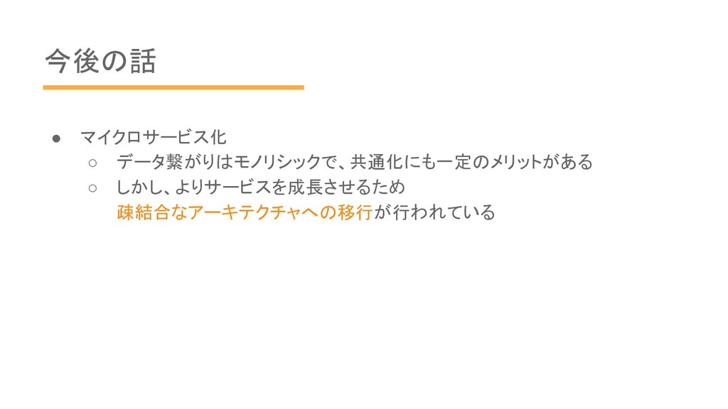 今後の話 • マイクロサービス化 ◦ データ繋がりはモノリシックで、共通化にも一定のメリットがある ◦ しかし、よりサービスを成長させるため 疎結合なアーキテクチャへの移行が行われている
