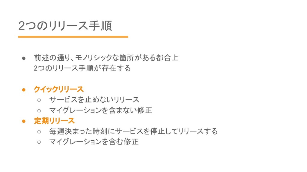 2つのリリース手順 • 前述の通り、モノリシックな箇所がある都合上 2つのリリース手順が存在する • クイックリリース ◦ サービスを止めないリリース ◦