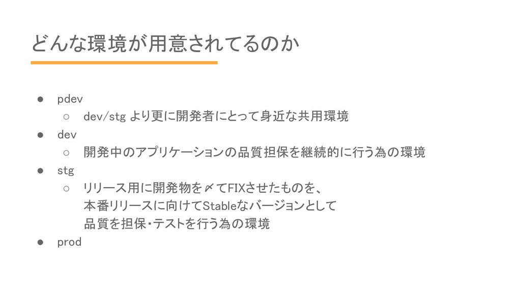 どんな環境が用意されてるのか • pdev ◦ dev/stg より更に開発者にとって身近な共用環境 • dev ◦ 開発中のアプリケーションの品質担保を継続的に行う為の環境